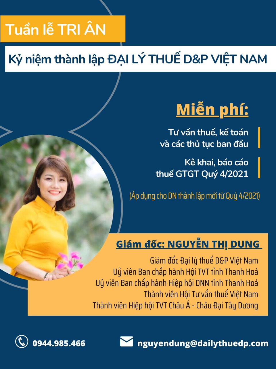 GIỚI THIỆUTôi là Nguyễn Thị Dung, Giám đốc Công ty TNHH Tư vấn và Đại Lý Thuế D&P Việt Nam.Lời đầu tiên, cho phép tôi được bày tỏ lòng biết ơn chân thành đối với Quý Khách hàng và Quý đối tác đã hợp tác và cùng phát triển với chúng tôi trong hơn 10 năm qua. Đại Lý Thuế D&P Việt Nam phát triển mạnh mẽ được như ngày hôm nay không chỉ là thành quả của sự hợp tác lâu dài và hiệu quả giữa các đối tác mà còn nhờ những nỗ lực không ngừng nghỉ của đội ngũ quản lý và nhân viên Công ty. Chúng tôi tin rằng thành công của Công ty luôn gắn liền với sự hài lòng từ các Khách hàng của mình. Kính chúc Quý đối tác, khách hàng luôn luôn phát triển. Nguyễn Thị Dung